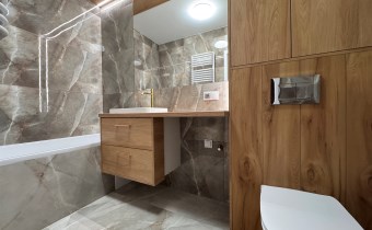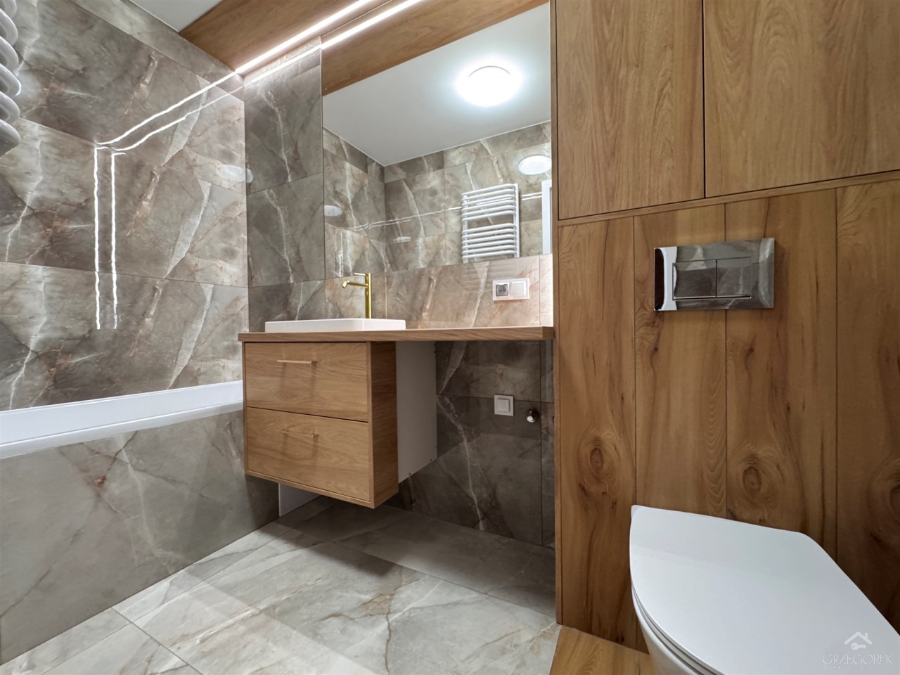 Na podłogach położone jasne panele, ściany w przyjemnych kolorach, wykończona łazienka z wanną i dużym lustrem oraz zabudową, w gustownych barwach, a także wygodna i elegancka kuchnia ze sprzętem: lodówką w zabudowie, piekarnikiem elektrycznym, płytą indukcyjną, okapem i zmywarką.