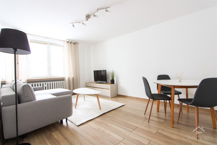 Standard mieszkania bardzo dobry - nadaje się do wprowadzenia. Wymieniono instalację elektryczną oraz hydrauliczną. Lokal wykończony jest w neutralnych i przyjemnych kolorach: nowe panele podłogowe, nowoczesna łazienka ze sporą ilością szafek do przechowywania oraz kuchnia ze stałą zabudową i sprzętami w zabudowie - piekarnikiem umieszczonym wyżej ze względu na komfort użytkowania, dużą zmywarką w zabudowie, płytą, okapem i wolnostojącą lodówką Samsung. W jednej z sypialni znajduje się duża szafa w zabudowie stałej, biurko, a w drugiej szafa wolnostojąca, szafka RTV, rozkładana kanapa. W salonie znajduje się wygodny stół z krzesłami, narożna rozkładana kanapa, stolik kawowy, szafka pod telewizor.